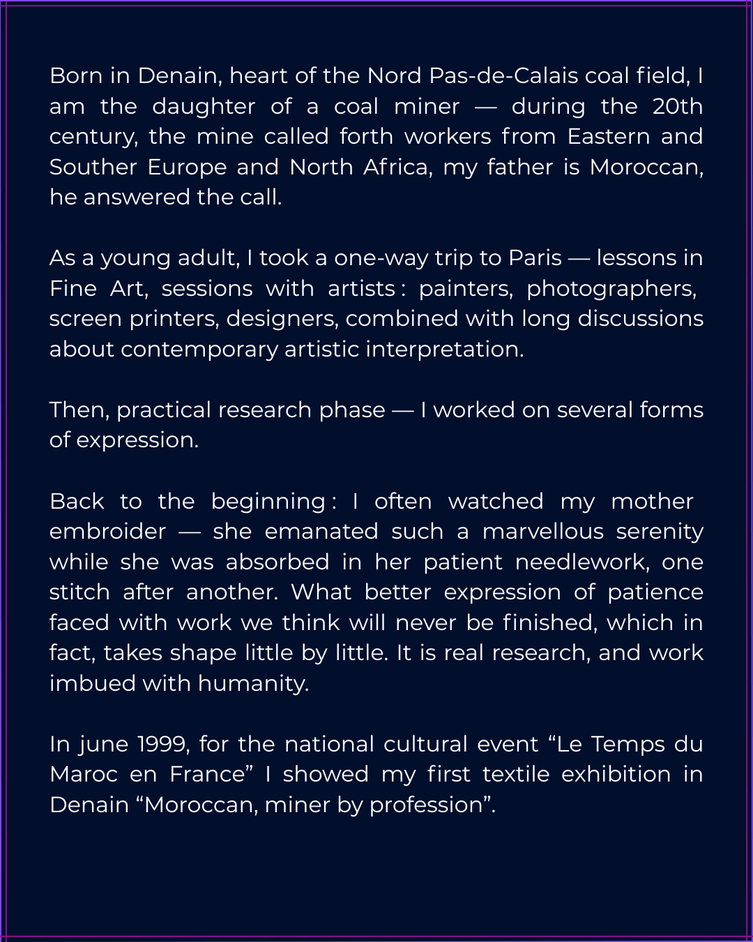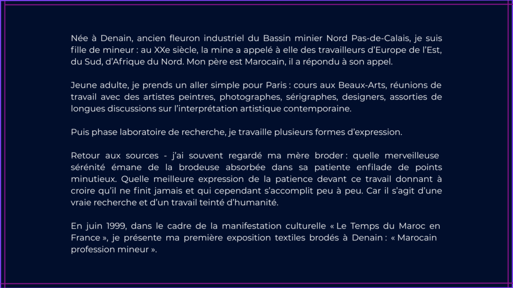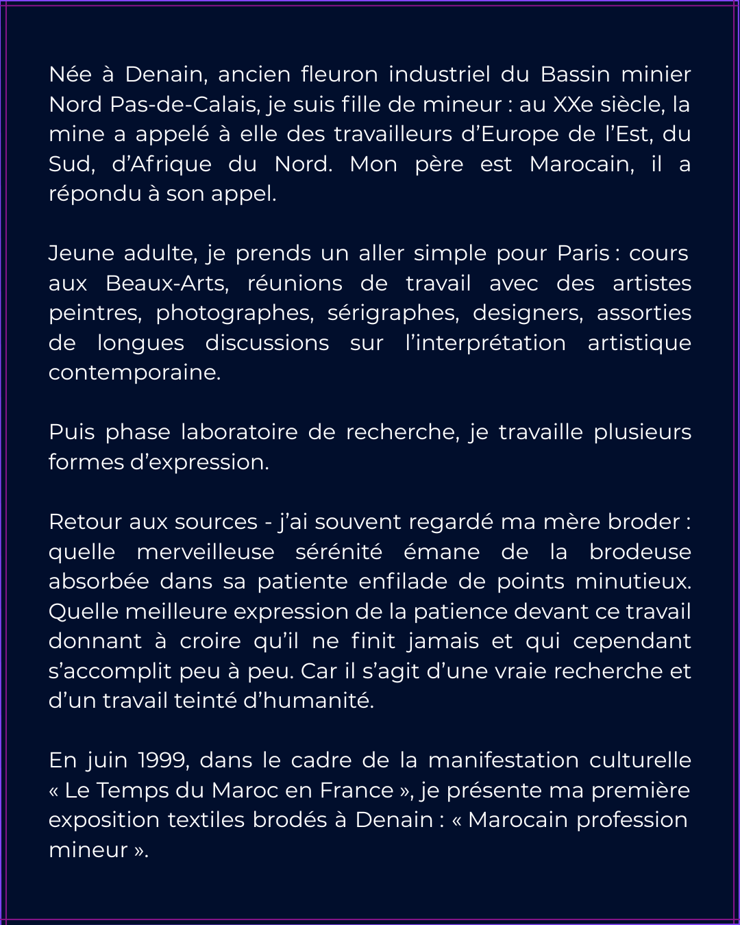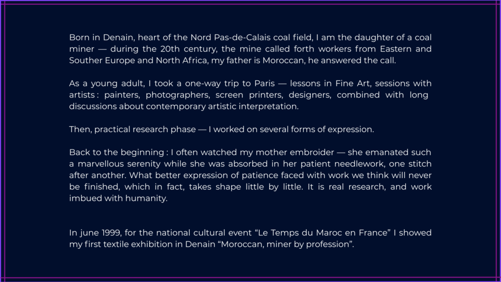 Ciels – Êtres – Terre Skies – Beings – Earths Informations Oeuvres, textes, photographies, conception graphique : SEDDIQ Yamina Plasticienne et Auteure Sociétaire SAIF Contact Navigation Accueil À propos Oeuvres Expositions collectives Ateliers Actualités Credits Site conçu par Marine Webdesign Hébergé par OVH Mentions légales Politique de confidentialité